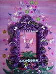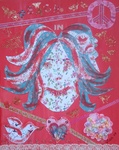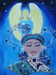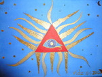 2010mei 2010 Tijdens een les spiritueel schilderen (wat ik enkele jaren heb gedaan) heb ik dit schilderij gemaakt. Het heeft heel lang boven de voordeur gehangen als bescherming voor het een of ander; ik heb geen idee waarom ik dacht dat dit beschermde. Toen het 2x achter elkaar naar beneden begon te vallen, heb ik het weggepakt en op mijn slaapkamer gezet; zulke tekens moet je serieus nemen.