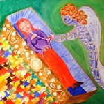 2010In 2010 was ik erg bezig met doodgaan, overgangen, andere dimensies, etc. Dit schilderij stelt mijn eigen dood voor. Van de 3e naar de 5e dimensie! Als je doodgaat snijdt je beschermengel het zilveren koord door dat de verbinding maakt tussen je ziel en je lichaam.