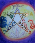 2014april 2014 Het Pentagram kent vele verschijningen en heeft verschillende betekenissen. In dit schilderij geeft het de elementen weer; water, aarde, vuur, lucht en spirit. Daarnaast laat het zien wat je ontvangt als je alle elementen toe laat in je leven; knowledge, wisdom, truth, love en power. Onderaan het pentagram een lotus. Lotus is heilig voor mij. Het staat voor de oorsprong van alles. Merry meet!