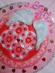 20143 juni 2014: Dit is het eerste schilderij in een reeks van 7. Hier wordt het 1e chakra uitgebeeld. De kleur hiervan is rood, het zintuig is ruiken, het getal is 4. Er is veel rood en roze gebruikt. En wat geurt er heerlijker dan versgebakken gezondere muffins. De 4 gebaksrondjes stellen de muffins voor. Ook de engel heeft haar dat lijkt op rookpluimen. Dit alles, samen met het zintuig voelen (de engelenvleugels zijn van superzacht, aaibaar materiaal). Dat is een teken dat ruiken voor mij, samenhangt met voelen. Zo mooi!